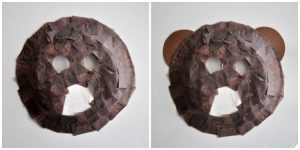 Staple the paper plate halves together and attach to the paper towel tube.